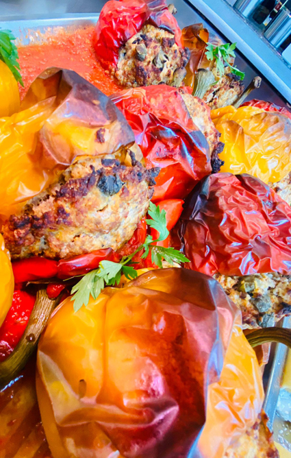 Poivrons farcis à la viande avec accompagnement de pâtes fraîches.